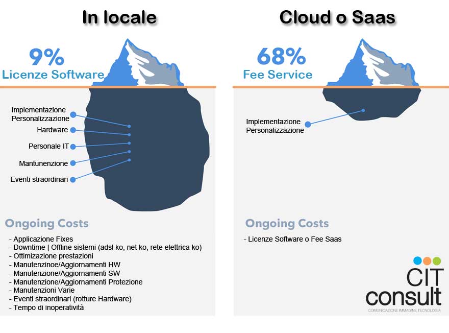 Tuttavia, un canone in abbonamento ti costerà quasi sempre di più che pagare lo stesso software in un’unica soluzione, quindi in questo senso, una soluzione “locale” potrebbe risultare più conveniente a lungo termine. In realtà, però, non è del tutto vero! Le soluzioni in “locale” hanno un enorme carico di costi “nascosti” che non possono essere preventivati a priori e a meno che non si dispone di un modo molto efficiente di gestirli, normalmente si finirà per spendere molto di più con una soluzione “locale” rispetto ad un cloud, un hosting o software in SaaS.