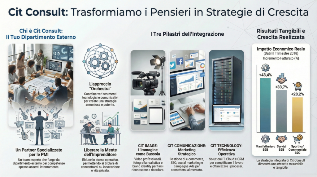 CIT Consult è un’aggregazione di consulenti e professionisti che ha adottato un metodo di business fondato sull’unicità del cliente e su un rapporto 1a1. Un unico riferimento è un valore aggiunto che vi permetterà di risparmiare tempo, denaro e risorse. Siamo professionisti a vostro servizio! Nell’era della comunicazione globale il connubio tra comunicazione, immagine e tecnologia diventa un fattore fondamentale per il conseguimento dei propri obbiettivi.