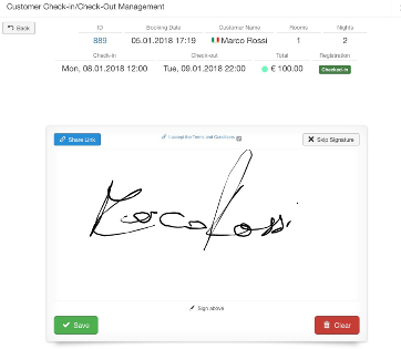 Receptionist e gestori possono impostare il sistema in modo che i clienti inseriscano una firma attraverso un Signature Pad compatibile con più dispositivi. La funzione di check-in è fondamentale per mantenere aggiornato il sistema e per memorizzare le informazioni di ciascun ospite che soggiorna in hotel. Al termine del processo di check-in, è anche possibile generare un documento di check-in in formato PDF con la firma del cliente e le informazioni sul trattamento della privacy.