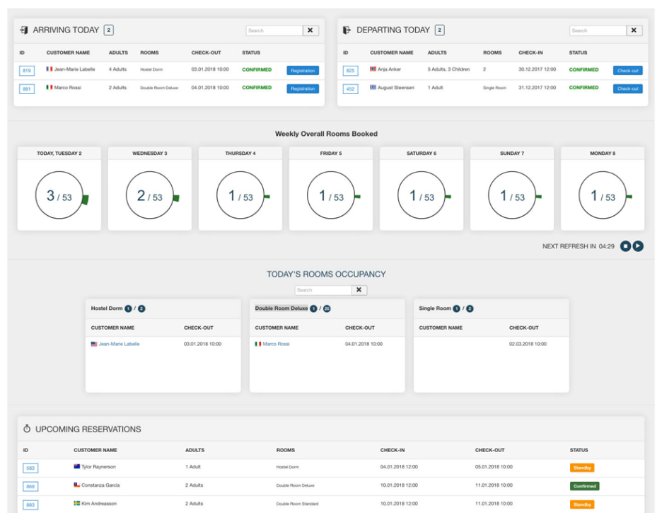 Il Booking viene utilizzato da centinaia di proprietà ogni giorno per dare il benvenuto ai clienti e per controllarli o eliminarli. La Dashboard è lo strumento perfetto per vedere facilmente una panoramica degli ospiti che arrivano, escono e soggiornano in hotel.