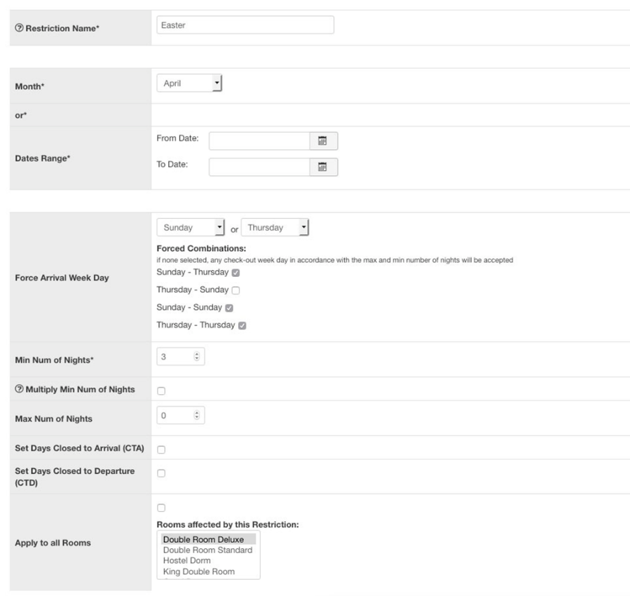 - Durata minima e massima del soggiorno : questo è quello che la maggior parte dei portali chiama MinLOS e MaxLOS ed è una funzione per definire il numero minimo / massimo di notti che possono essere prenotate in determinate date / mesi dell'anno.